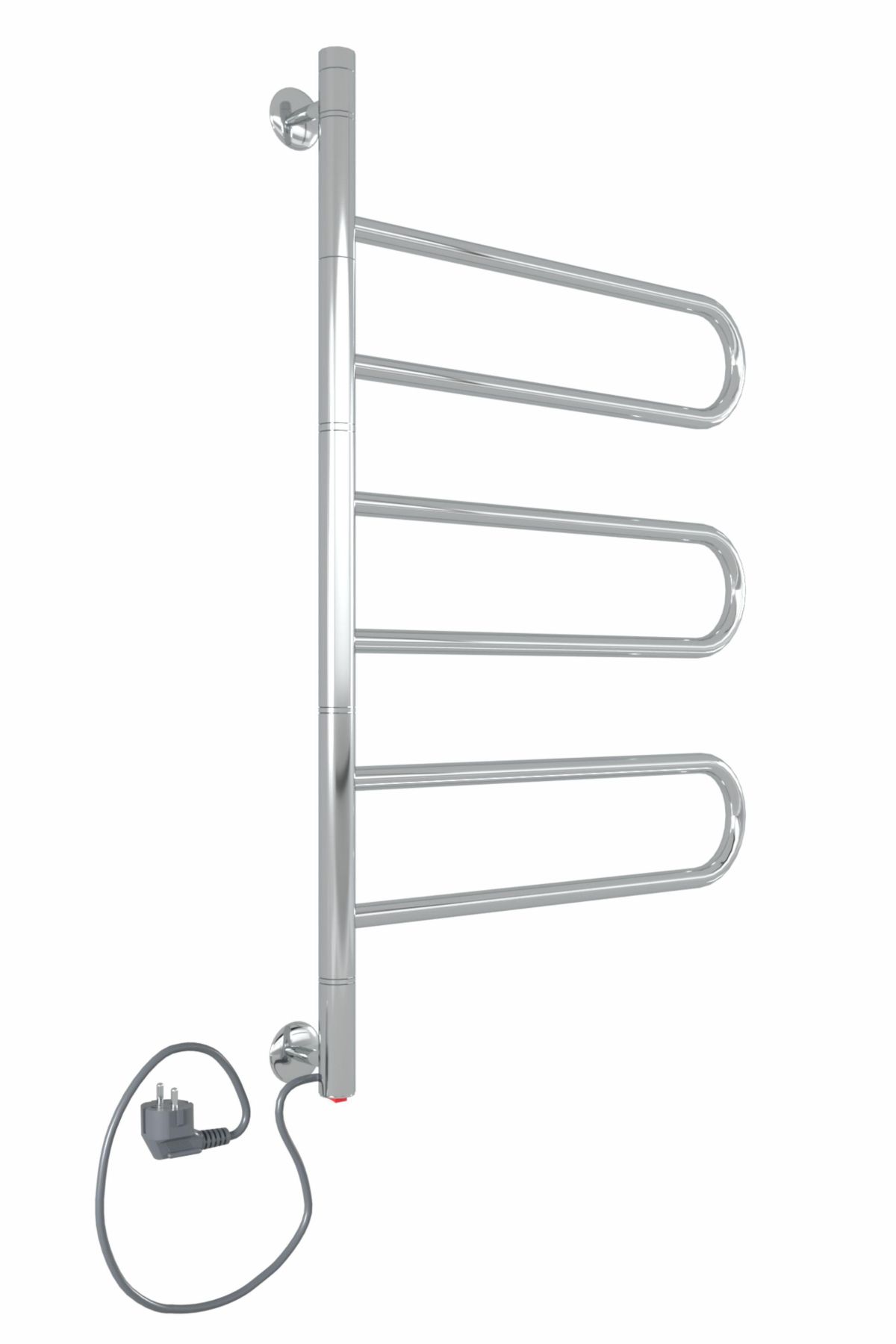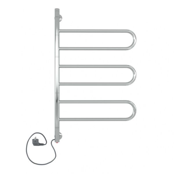 Полотенцесушитель поворотный оснащен кнопкой включения в нижней части стойки. Универсальность изделия предусматривает подключение через прямой провод или скрытое подключение через дополнительный модуль. Длина прямого провода 1,2 метра.