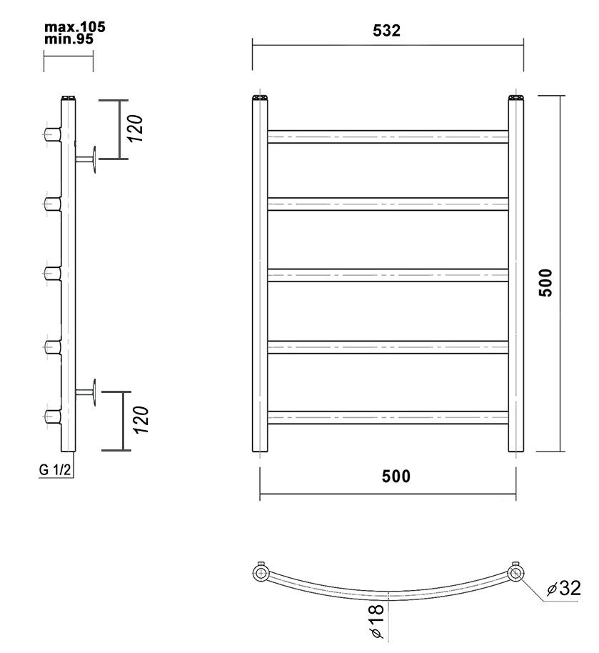 М/о расстояние (межосевое расстояние): 500Количество перекладин: 5Коллекция: КалипсоТип: водяныеЦвет: черныйШирина (мм): 532Высота (мм): 500Глубина (мм): 105-95Вес: 3,79Объем: 0,045Тэн/подключение: нижнееСтрана: РоссияГарантия: 10 лет