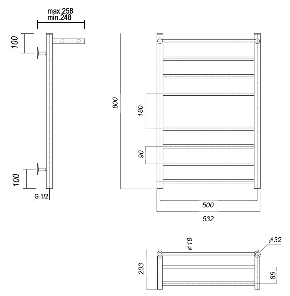М/о расстояние (межосевое расстояние): 500Количество перекладин: 8Коллекция: Медея с полкойТип: водяныеЦвет: хромШирина (мм): 532Высота (мм): 800Глубина (мм): 258-248Вес: 5,9Объем: 0,1Страна: РоссияГарантия: 10 лет