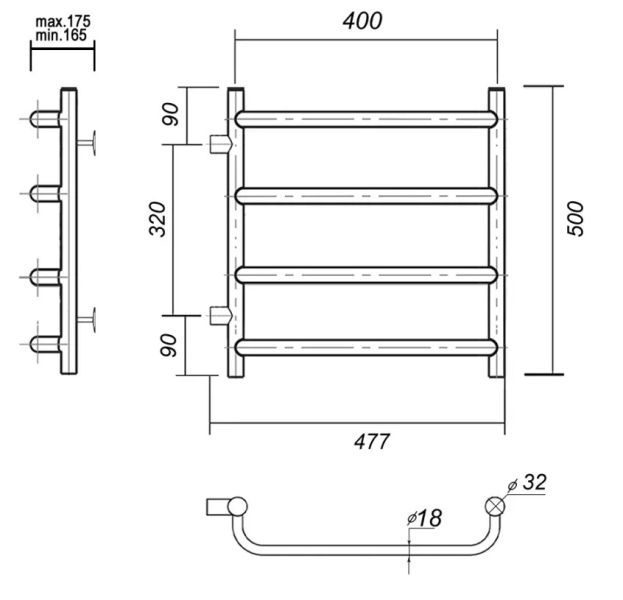 Полотенцесушитель водяной Domoterm Стефано П4 400х500-320 боковой, хром.Водяной полотенцесушитель из нержавеющей пищевой стали. Цвет «хром» – полированная сталь. Труба электросварная, толщина стенки 2 мм. Вертикальные стойки имеют диаметр 32мм., горизонтальные перекладины выполнены из трубы диаметром 18мм.Подключение к ГВС боковое, резьба наружная, 1".М/о расстояние (межосевое расстояние): 320.Количество перекладин: 4.Коллекция: Стефано.Тип: водяные.Цвет: хром.Ширина (мм): 477.Высота (мм): 500.Глубина (мм): 175-165.Вес: 3,2.Объем: 0,002.Тэн/подключение: боковое.Страна: Россия.Гарантия: 10 лет.