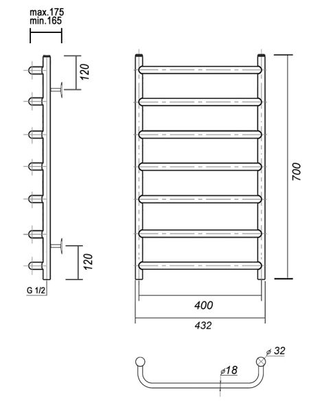 М/о расстояние (межосевое расстояние): 400Количество перекладин: 7Коллекция: СтефаноТип: водяныеЦвет: хромШирина (мм): 432Высота (мм): 700Глубина (мм): 175-165Вес: 2,9Объем: 0,057Страна: РоссияГарантия: 10 лет