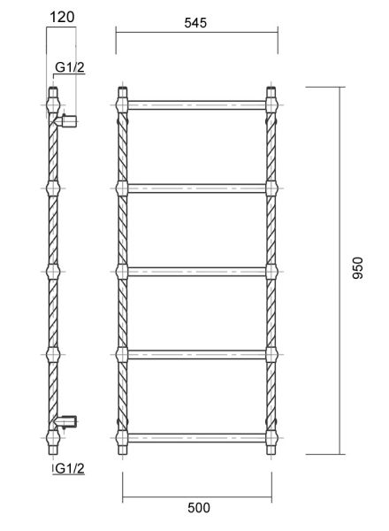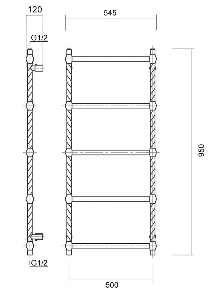 Количество перекладин: 5Коллекция: ВинтажТип: водяныеЦвет: античная бронзаШирина (мм): 500Высота (мм): 950Глубина (мм): 120Вес: 5,9Объем: 0,07695Тэн/подключение: нижнее