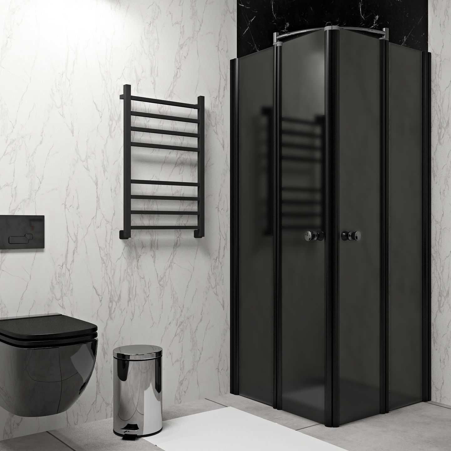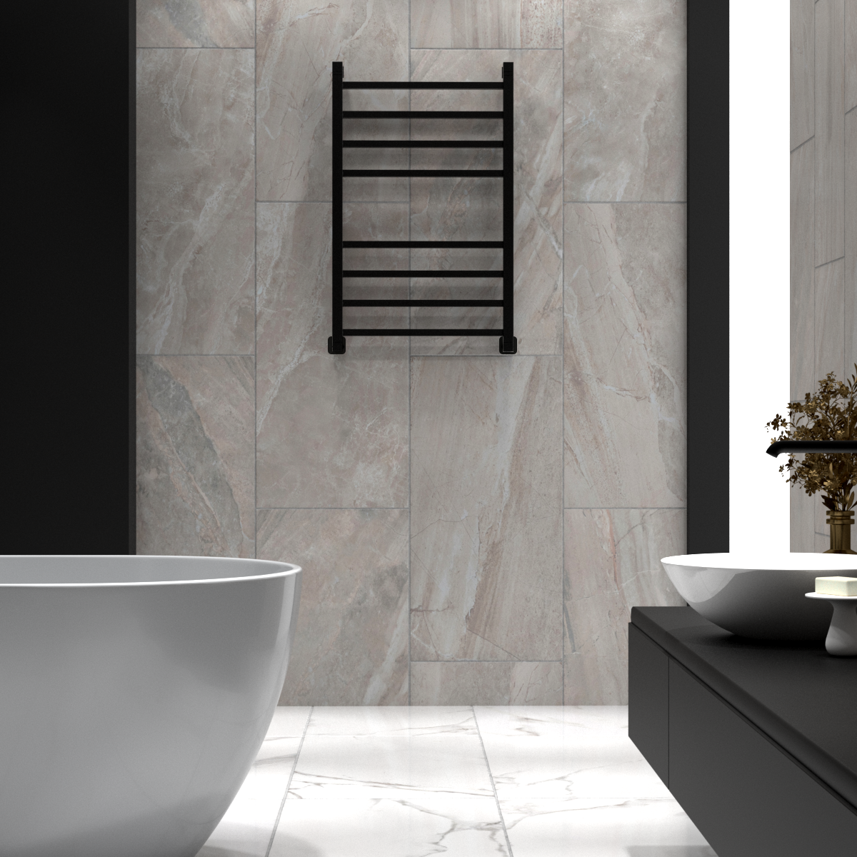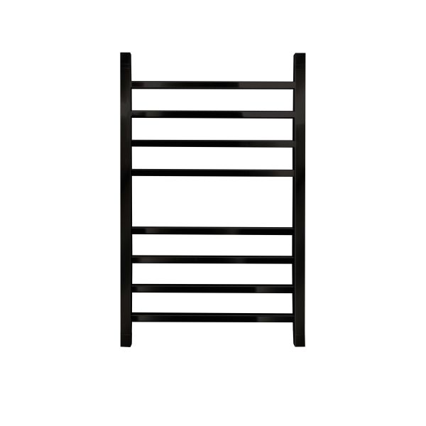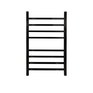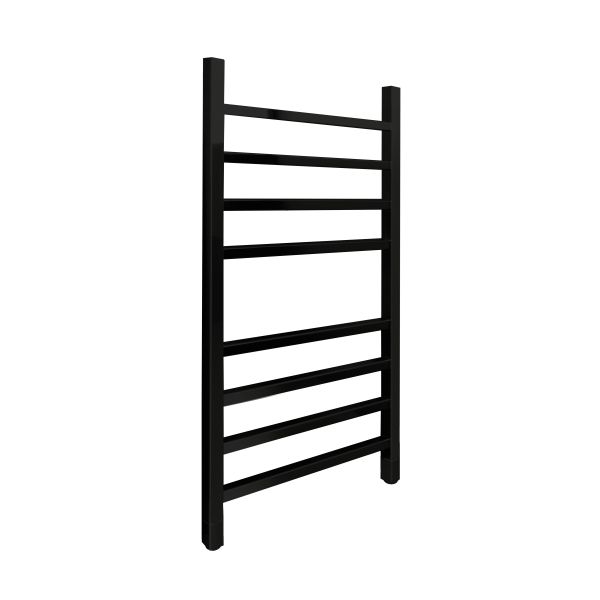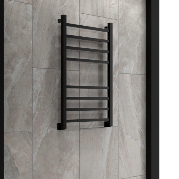 Полотенцесушитель водяной INDIGO Aletto в цвете «Черный Муар» в виде классической лесенки, но при этом коллектор и перекладины выполнены из квадратной трубы.