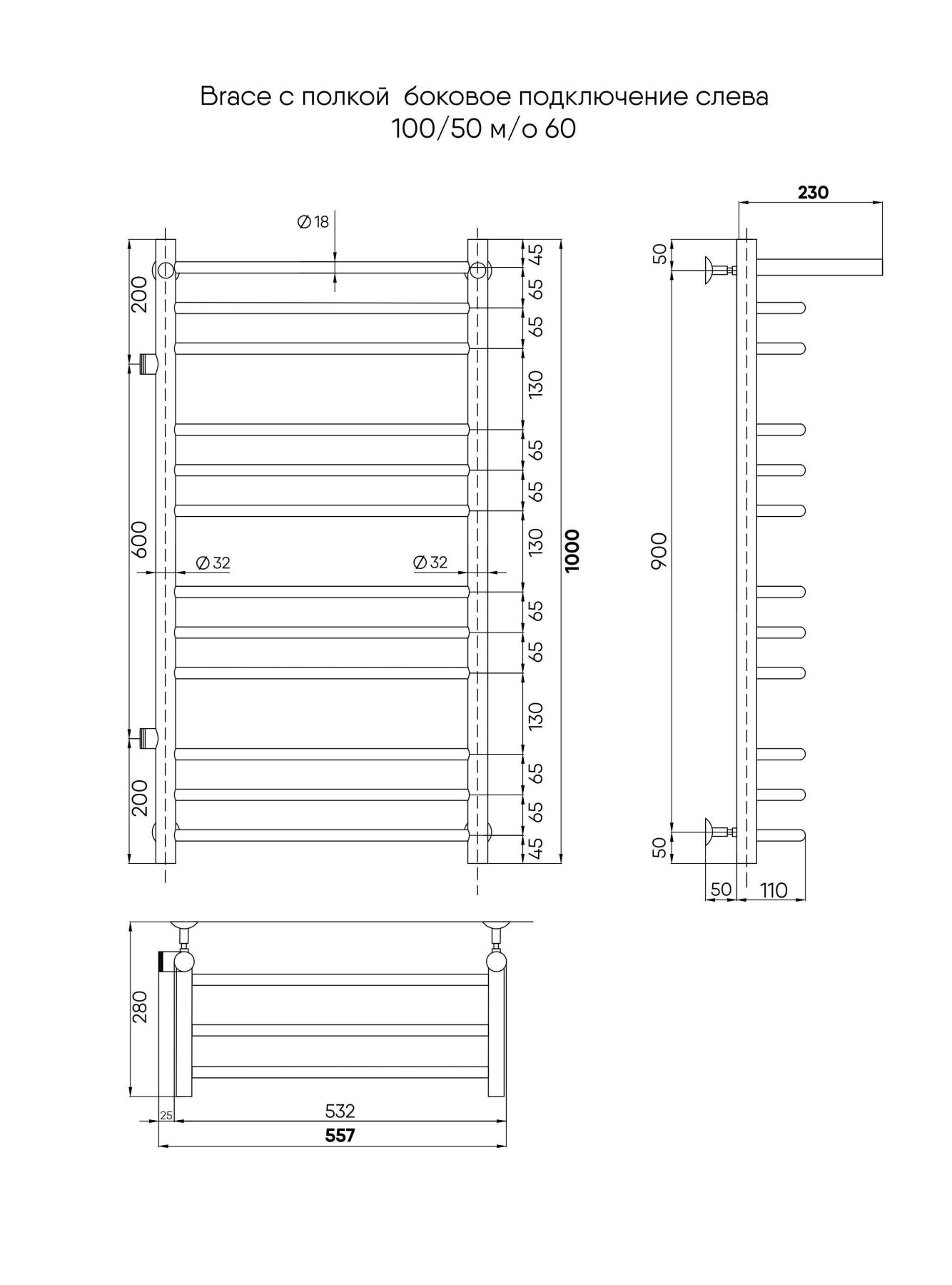 Полотенцесушитель водяной INDIGO Brace с полкой со скобообразными перекладинами и боковым подклю... Подробнее