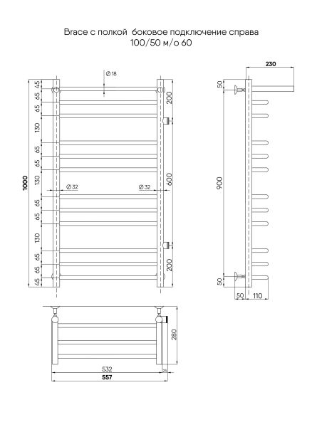 Полотенцесушитель водяной INDIGO Brace с полкой со скобообразными перекладинами и боковым подключением, выполнен в цвете «Черный Муар». Полотенцесушитель с полками одна из самых популярных моделей, так как она позволяет дополнительно разместить на изделии полотенца и халаты.