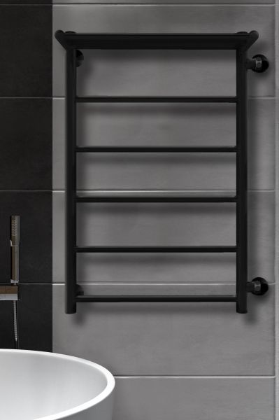 Полотенцесушитель водяной INDIGO Line с полкой выполнен в цвете «Черный Муар». Форма «лесенка» является классической и пользуется большим спросом у покупателей из-за своей функциональности, ведь на ней можно разместить большое количество текстильных изделий.