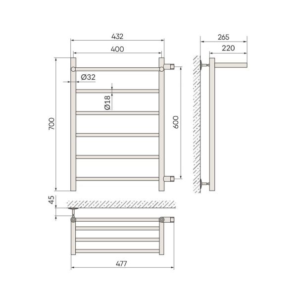 Модель изготовлена из высококачественной нержавеющей стали. Качественная металлообработка в местах подключений обеспечивает плотное прилегание прокладки. Может быть использован также как вешалка для полотенец в ванную.