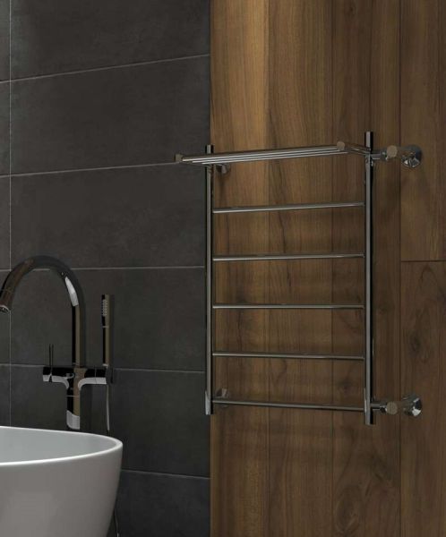 Водяной полотенцесушитель в форме Лесенки Line с полочкой – это оригинальный элемент не только с прямыми или накладными перекладинами, но и дополнительной полкой для полотенец, халатов и других мелочей.