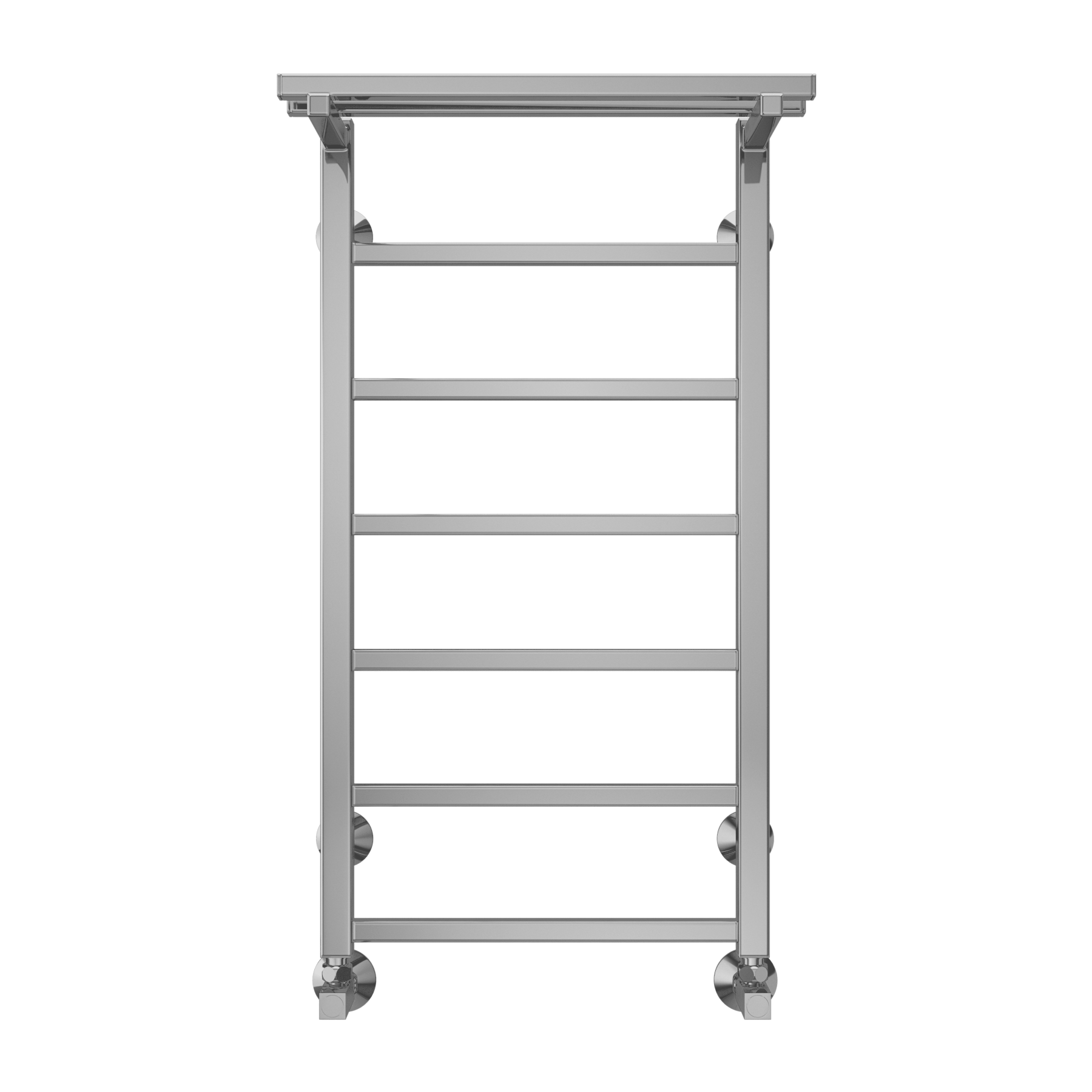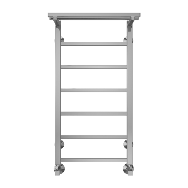 Модель "Контур с полкой" относится к линейке в стиле хай-тек, тяготеющей к лаконичным формам и хромированным поверхностям, и отличается наличием дополнительной прогреваемой полки для хранения и сушки полотенец.