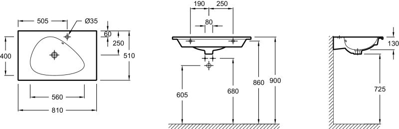 РАЗМЕТКА СВЕРЛЕНИЯ ОТВЕРСТИЯ ДЛЯ СМЕСИТЕЛЯ: 1 сквозное отверстие