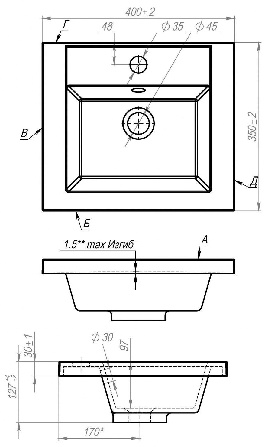 - Диаметр отверстия под смеситель: 35 мм