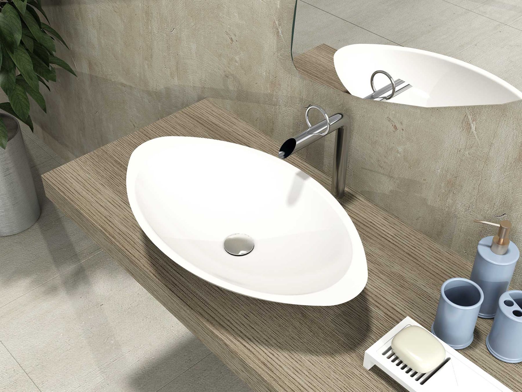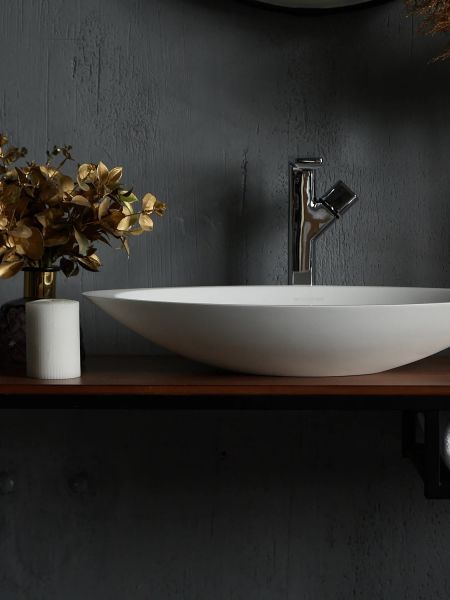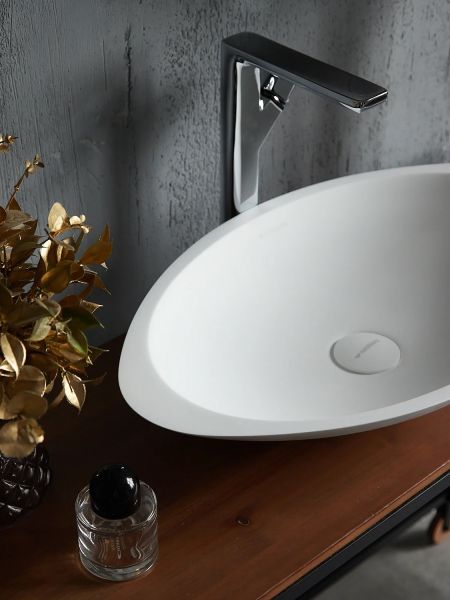 Раковина из искусственного камня для ванной комнаты линейки Montebianco Gondola / Gondola Tre.Модель овальной формы с утолщенными бортиками слева и справа. Gondola Tre вытянута в длину, что позволяет избежать разбрызгивания воды при умывании. При этом она компактнее многих круглых моделей в ширину, что позволяет разместить ее на столешнице меньшего размера или обрести больше свободного пространства. Устанавливается на поверхность столешницы или мебели сверху накладным способом. Уход за раковиной из искусственного камня прост: в большинстве случаев достаточно протереть поверхность влажной губкой с чистящим средством. Материал не впитывает влагу, не порист, непроницаем для плесени, бактерий и грибков.Gondola Tre имеет матовую, бархатистую поверхность. Полимерный материал принимает температуру окружающей среды, поэтому в жилом пространстве данная модель раковины всегда будет приятной на ощупь.Отличие Gondola Tre от раковины Gondola – в размерах и особенностях формы. Последняя имеет ассиметричную форму и встроенный подиум, отделяющий чашу от поверхности установки.