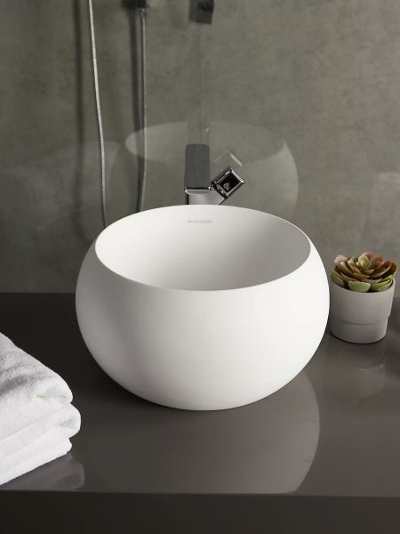 Раковина из искусственного камня для ванной комнаты круглой формы. Дизайн модели необычен и уникален, побуждает пофантазировать над использованием в интерьере. Конструкция полая внутри, что обеспечивает ее легкость. Однако внешне кажется, что раковина высечена из цельного камня. Palla имеет матовую, бархатистую поверхность. Благодаря выпуклой структуре стенок чаши вся поверхность раковины доступна визуально, что позволяет максимально выгодно презентовать ее окружающим. Полимерный материал принимает температуру окружающей среды, поэтому в жилом пространстве данная модель раковины всегда будет приятной на ощупь.Данная модель устанавливается на поверхность столешницы или мебели накладным способом сверху. Чаша обладает большей глубиной, чем многие накладные раковины бренда Montebianco.Уход за раковиной из искусственного камня прост: в большинстве случаев достаточно протереть поверхность влажной губкой с чистящим средством. Материал не впитывает влагу, не порист, непроницаем для плесени, бактерий и грибков.