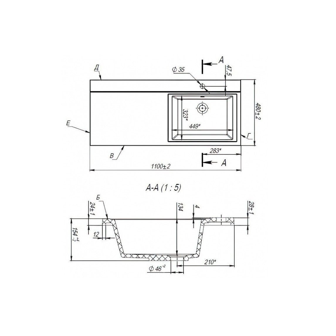 • Намеченные отверстия под смеситель: