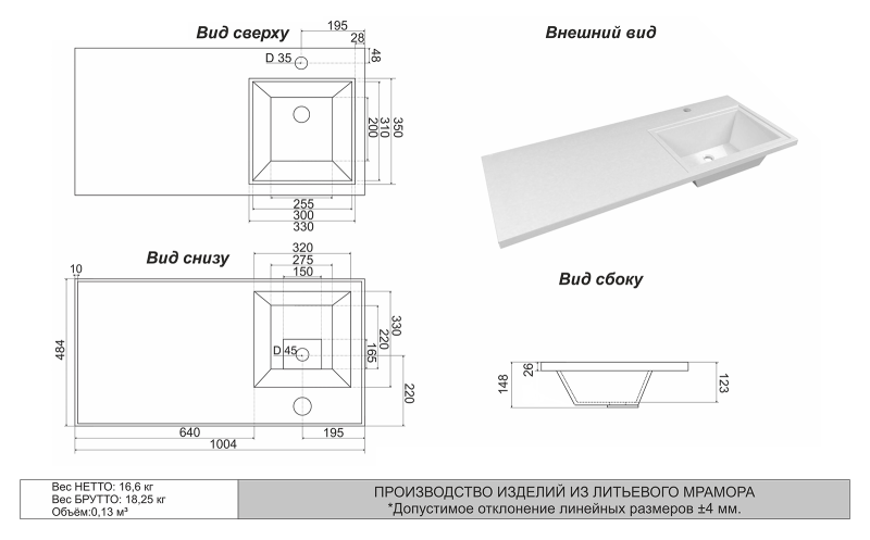 Тип: раковиныПо форме: прямоугольныеРазмер, мм (ШxГxВ): 1002x484x140Размер в упаковке, мм (ШxГxВ): 1032x514x170Цвет: белыйВес с упаковкой, кг: 23.24По монтажу: мебельнаяМатериал: литьевой мраморОсобенности: установка над стиральной машиной, со столешницей