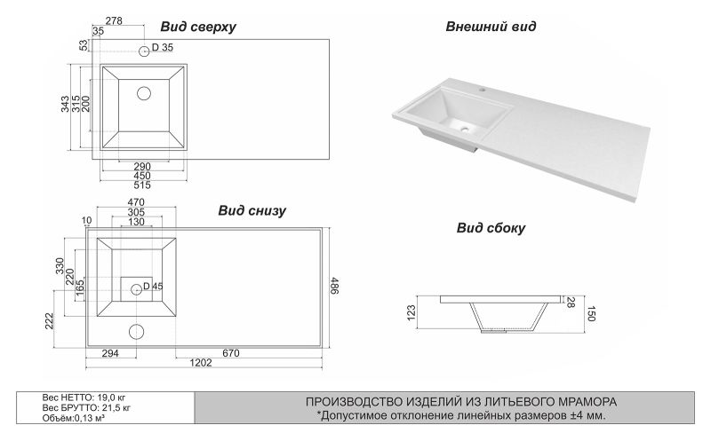 Тип: раковиныПо форме: прямоугольныеРазмер, мм (ШxГxВ): 1200x480x160Размер в упаковке, мм (ШxГxВ): 1230x510x190Цвет: белыйВес с упаковкой, кг: 25.3По монтажу: мебельнаяМатериал: литьевой мраморОсобенности: установка над стиральной машиной, со столешницей