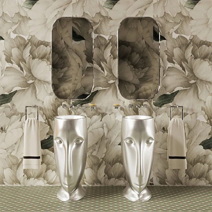 Раковина напольная Kerasan Artwork Moloco, слив в стену, цвет bianco-argento серебро, 474086Раковина свободностоящая "MOLOCO", слив в стену: