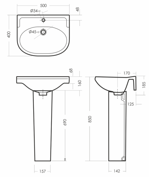 Умывальник КОМФОРТ представлен в базовом размере 50 сантиметров и с возможностью монтажа к стене или на кронштейны.
