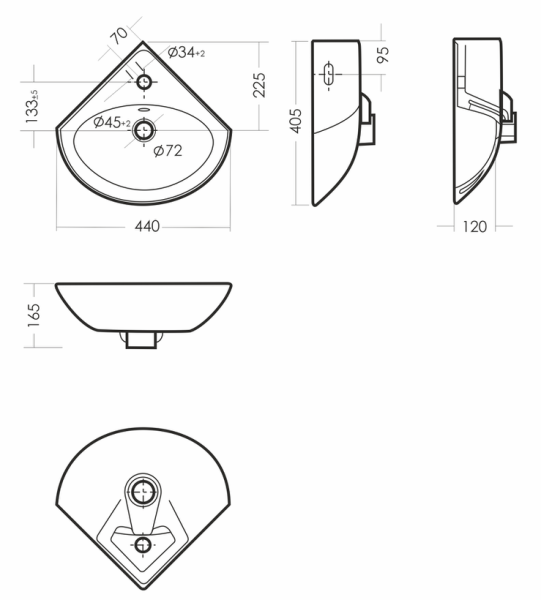 Размеры умывальника: 440 x 405 x 165