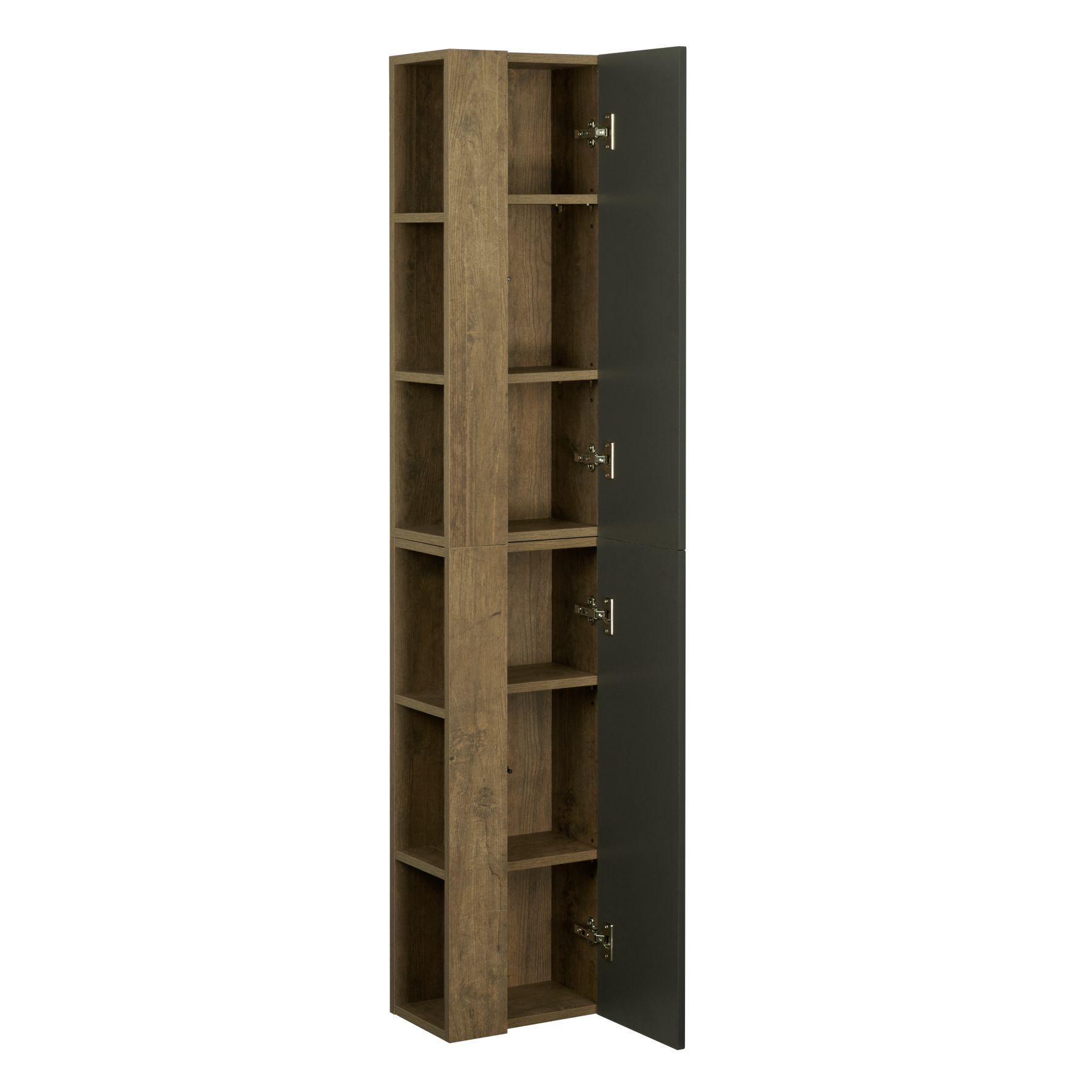 - Корпус выполнен из высококачественной декоративной влагостойкой ЛДСП дуб кантри, фасад - из МДФ в пленке цвета антрацит, что позволяет защитить поверхность колонны от внешних воздействий