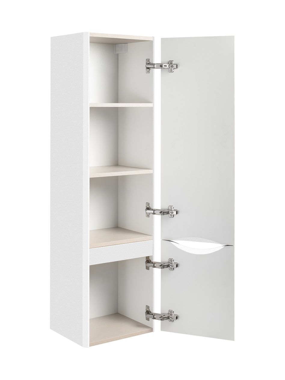 Шкаф пенал для ванной комнаты Runo Тоскана (подвесной) - выполнен в ультрасовременном дизайне в классическом белом цвете. Пенал отличается изысканным дизайном, скруглённые углы, древесная текстура фасада, врезная ручка – придают шкафу необычный и незабываемый внешний вид. Шкаф в ванную комнату оснащён двумя распашными дверцами, в верхнем отделении две встроенные полки. Каждая дверца укомплектована двумя петлями, верхняя с доводчиком, нижняя без доводчика. Мебель для ванной RUNO - красота и практичность в мелочах!