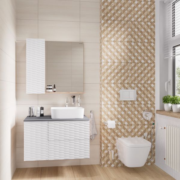 Шкаф-зеркало Альба 80 см отражает современные тенденции в дизайне мебели для ванных комнат: белый матовый цвет с 3D рисунком безупречно сочетается с текстурой под дерево, отсутствие лишних деталей.