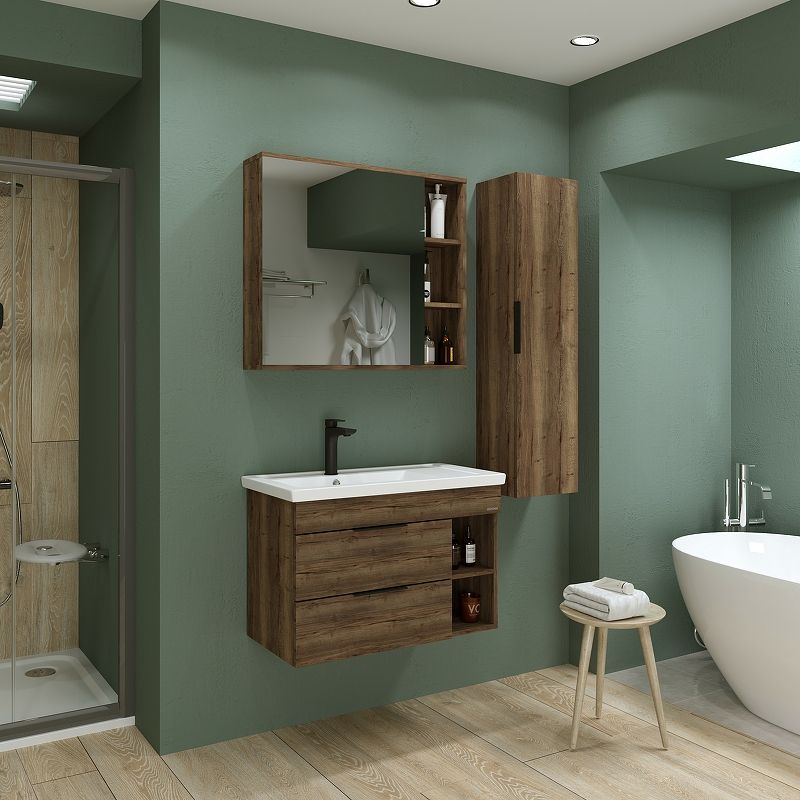 Открытые полки обеспечивают доступ к аксессуарам, а пространство за распашной зеркальной дверцей с механизмом плавного закрывания, разделенное полочкой, позволит хранить бытовые принадлежностей.