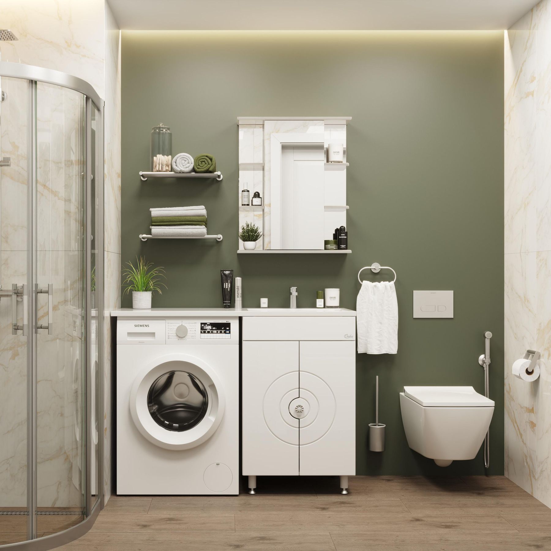 В центре шкафа - зеркальная дверца с механизмом плавного закрывания, за которой скрывается отделение для хранения, разделенное на две части горизонтальной полочкой. По бокам - открытые полочки для косметических средств или декоративных элементов.