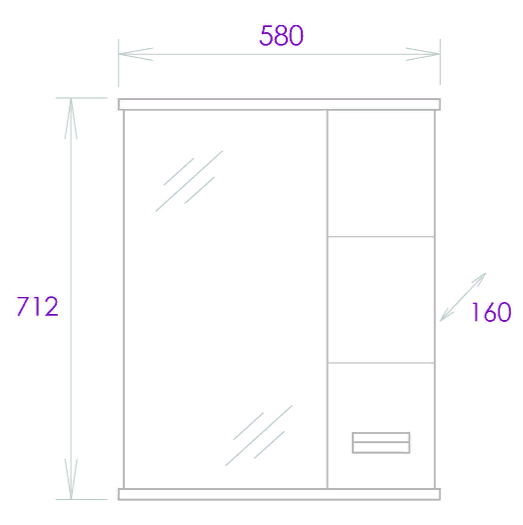 Справа от зеркала за распашной дверцей с механизмом плавного закрывания расположено отделение для хранения, разделенное на две части горизонтальной полочкой, под зеркалом - открытая полочка для косметических средств или декоративных элементов.