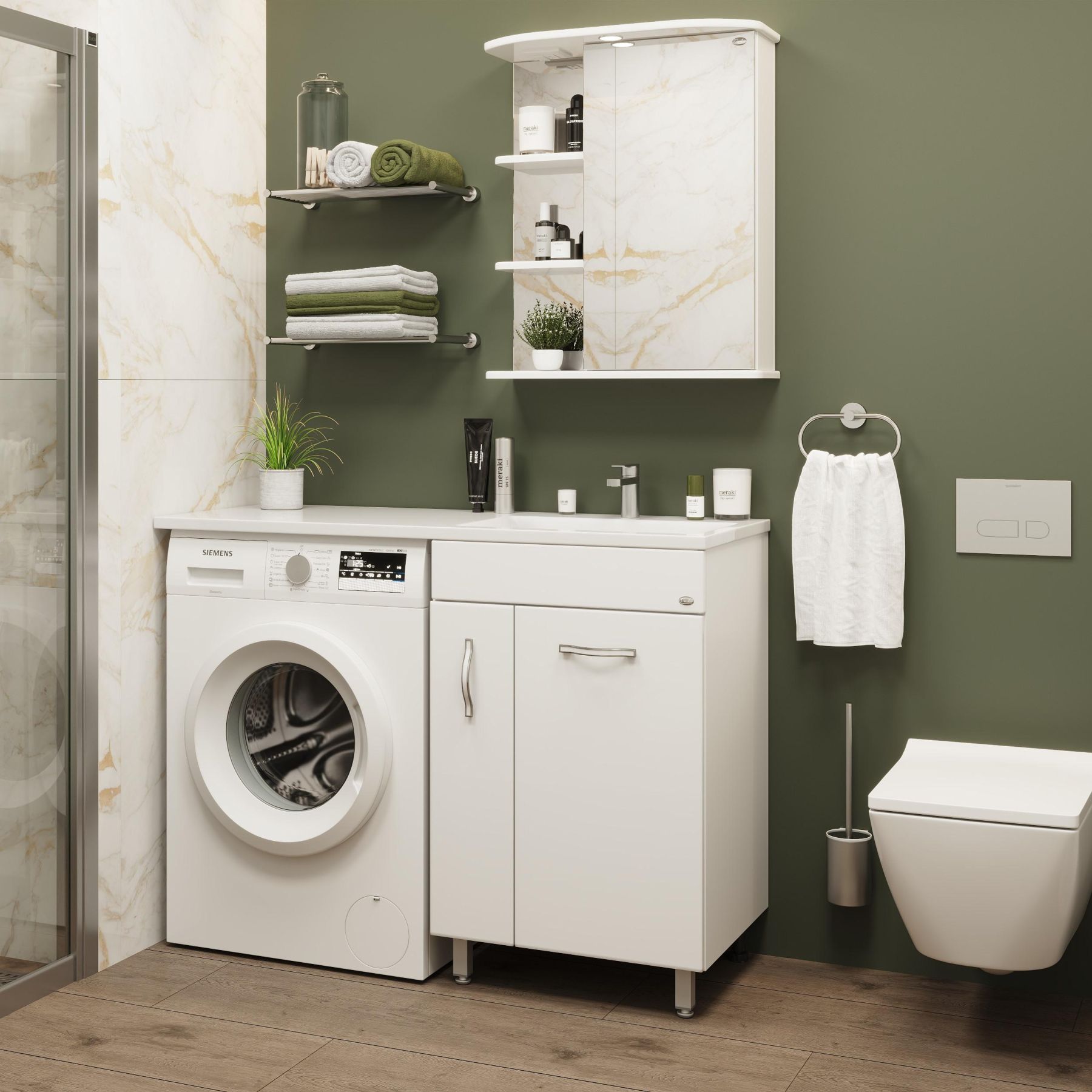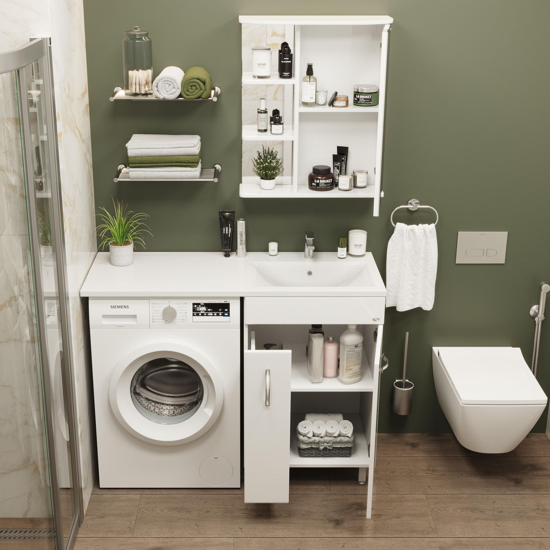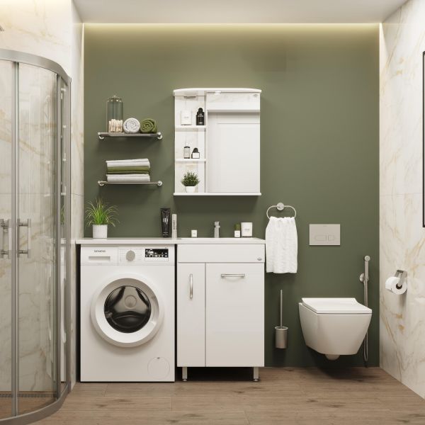 Открытые полочки слева обеспечивают быстрый доступ к часто используемым аксессуарам, а пространство за распашной зеркальной дверцей с механизмом плавного закрывания, разделенное полочкой, станет удобным местом для хранения различных бытовых принадлежностей.