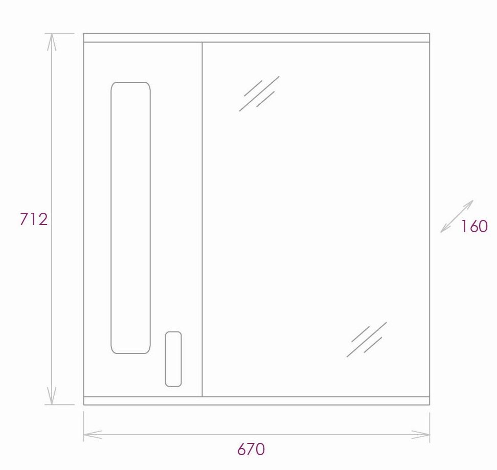 Слева от зеркала за распашной дверцей с механизмом плавного закрывания расположено отделение для хранения, разделенное полкой, под зеркалом - открытая полочка для косметических средств или декоративных элементов.