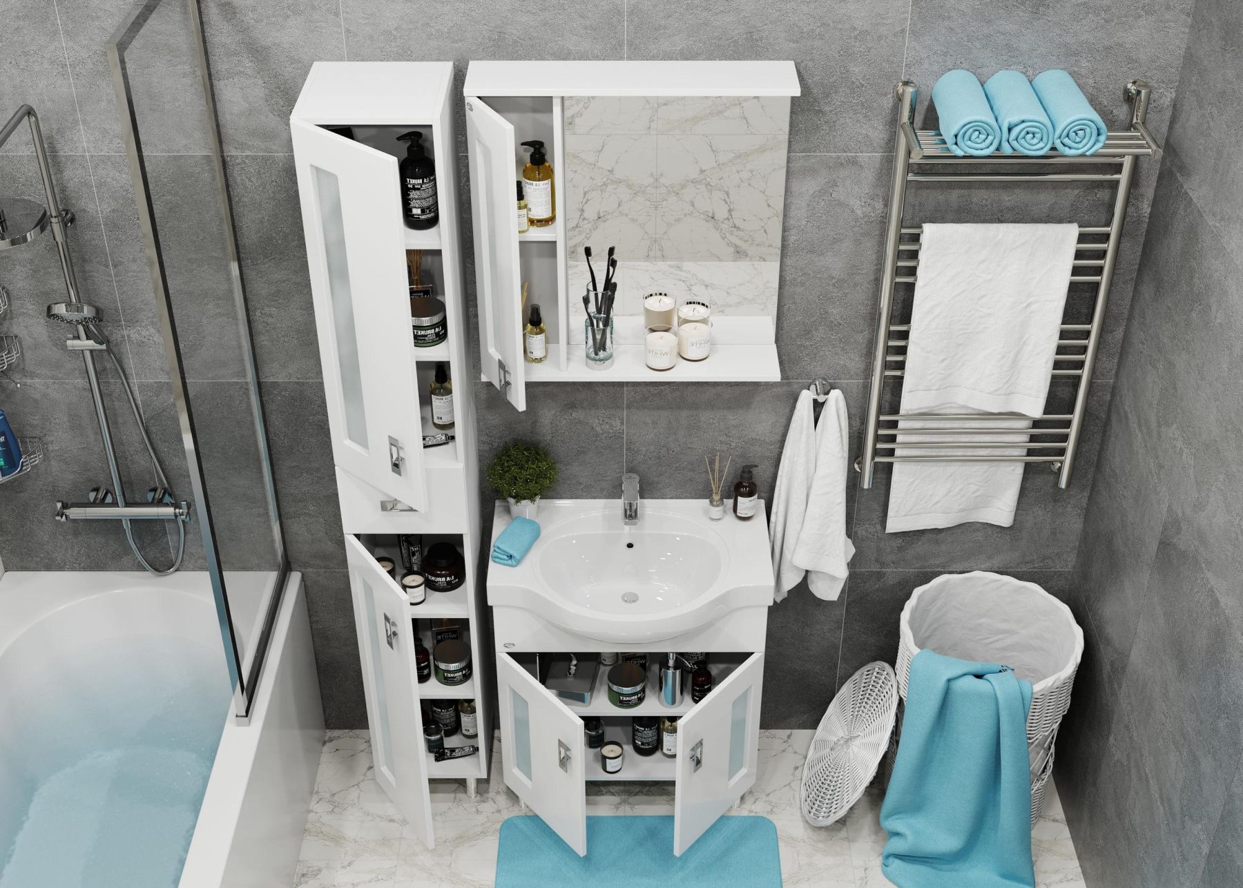 Белоснежный цвет фасада в сочетании со вставками из матового стекла и хромированными ручками необычной формы придадут ванной комнате ощущение свежести, чистоты и уюта.