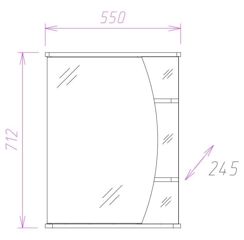 Справа за распашной зеркальной дверцей с механизмом плавного закрывания расположено вместительное отделение для хранения, разделенное на 3 части горизонтальными полочками, справа - 3 открытые полочки для косметических средств или декоративных элементов.