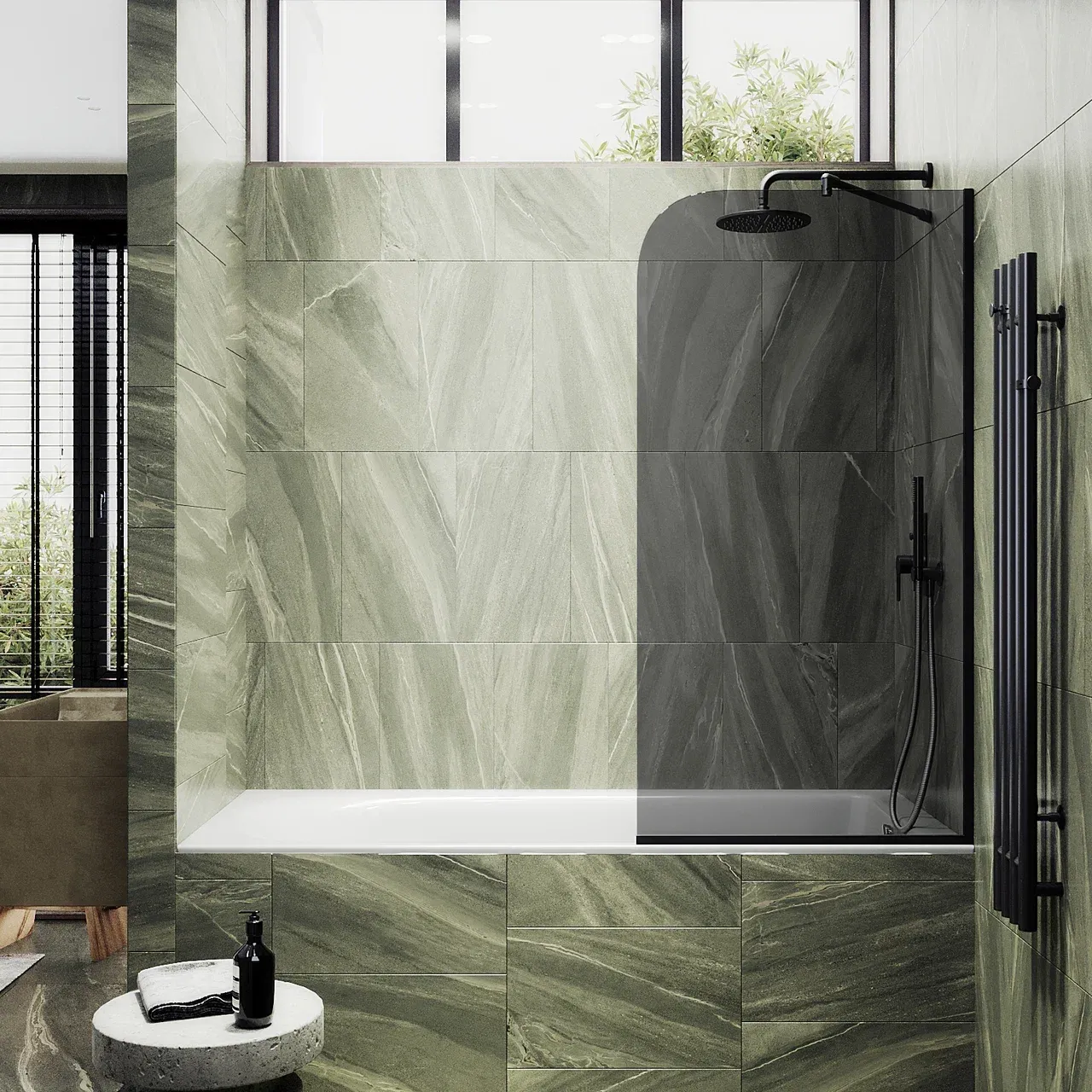 Монтаж осуществляется с помощью алюминиевого профиля, что обеспечивает надежность крепления и безопасность использования стеклянной перегородки для ванной. Также, шторка оснащена специальным уплотнителем, который предотвращает попадание воды на пол ванной комнаты. Закаленное стекло, цвет Графит, толщина 6 мм 1400х340 мм - 1 шт.