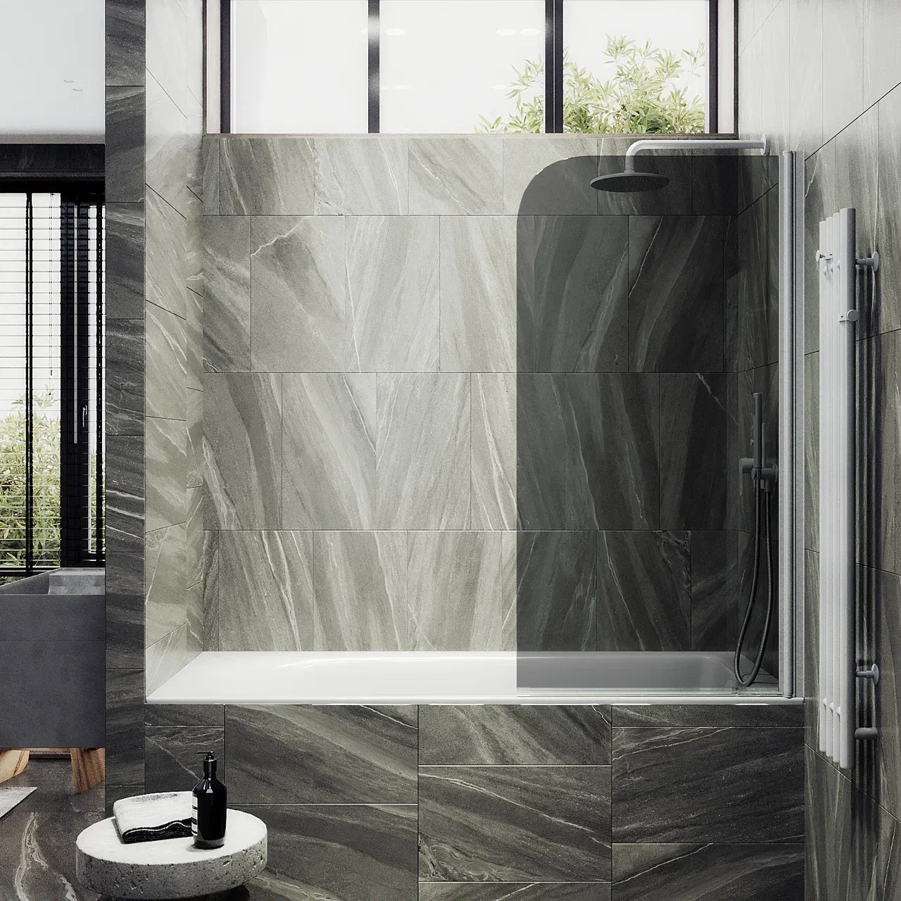 Монтаж осуществляется с помощью алюминиевого профиля, что обеспечивает надежность крепления и безопасность использования стеклянной перегородки для ванной. Также, шторка оснащена специальным уплотнителем, который предотвращает попадание воды на пол ванной комнаты, а также поворотным механизмом, что облегчает уход за сантехникой и делает использование ширмы максимально комфортным. Закаленное стекло, цвет Графит, толщина 6 мм 1400х540 мм - 1 шт.