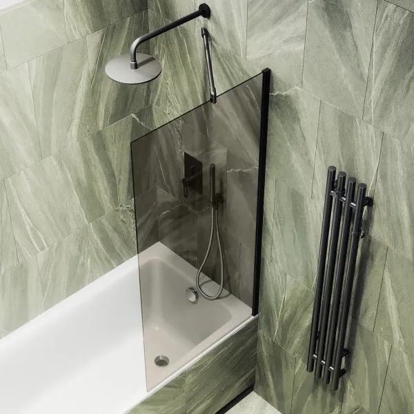 Монтаж осуществляется с помощью алюминиевого профиля, что обеспечивает надежность крепления и безопасность использования стеклянной перегородки для ванной. Также, шторка оснащена специальным уплотнителем, который предотвращает попадание воды на пол ванной комнаты. Закаленное стекло, цвет Бронза, толщина 8 мм 1400х800 мм - 1 шт.