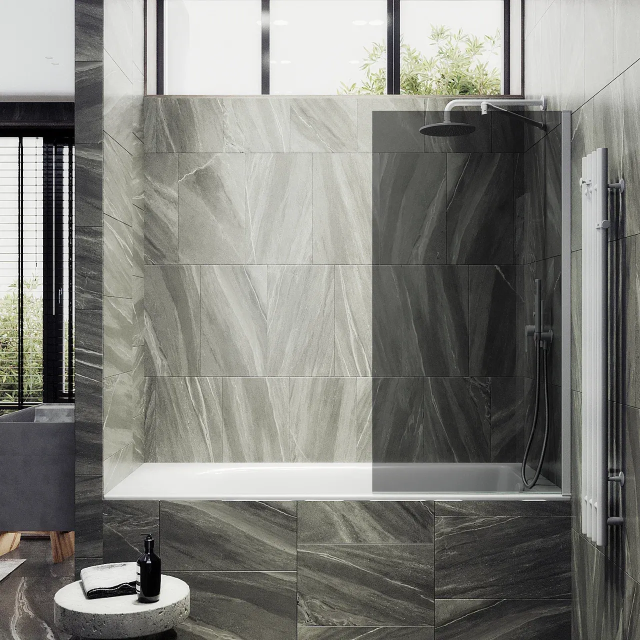 Монтаж осуществляется с помощью алюминиевого профиля, что обеспечивает надежность крепления и безопасность использования стеклянной перегородки для ванной. Также, шторка оснащена специальным уплотнителем, который предотвращает попадание воды на пол ванной комнаты. Закаленное стекло, цвет Графит, толщина 8 мм 1400х900 мм - 1 шт.