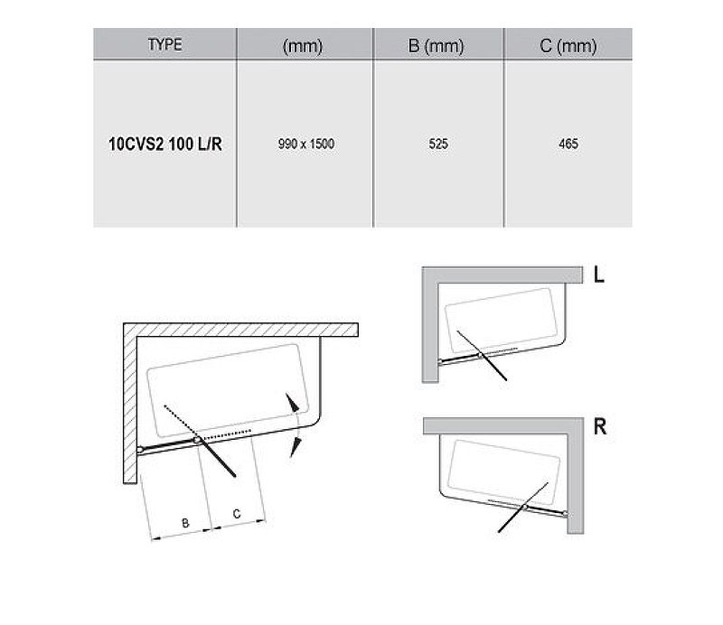 ШТОРКА НА ВАННУ RAVAK 10° 10CVS2-100 L 7QLA0U03Z1 левая, профиль сатин, прозрачное стекло