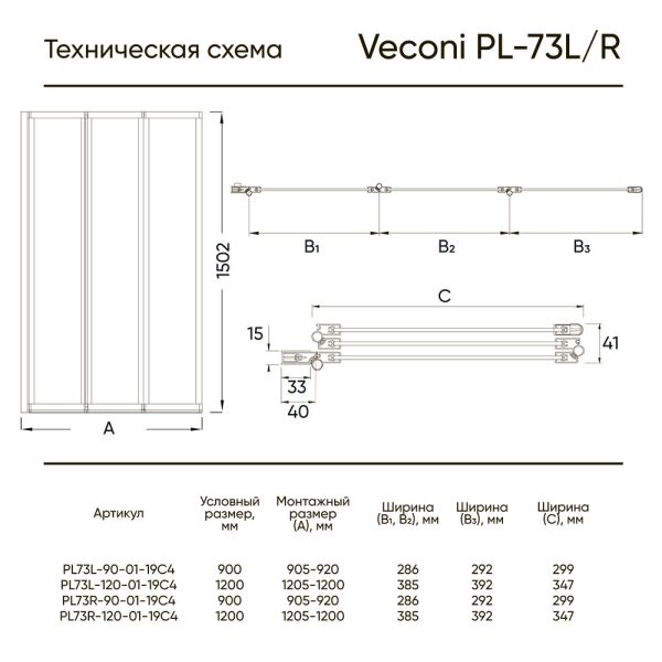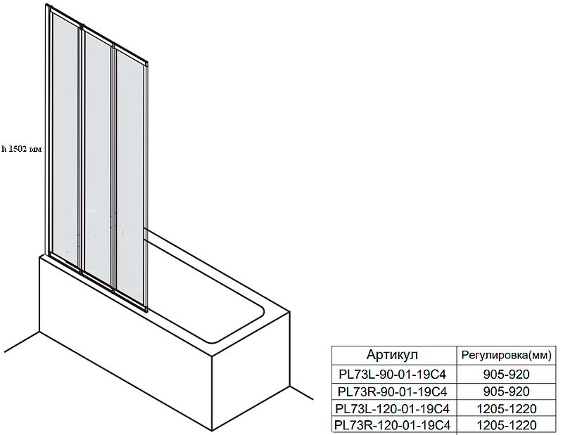Шторка на ванну Veconi Palau PL-73L, 900x1500, хром, стекло прозрачное