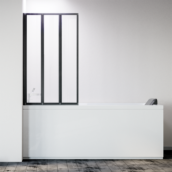 Шторка на ванну складная левая Veconi Palau, PL-73BL, 900x1500, черный матовый, прозрачное стекло