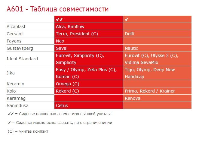 • Для унитазов в соответствии с таблицой совместимости