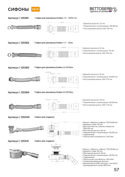 Сифон Bettoserb 125341 для поддона слив 90мм