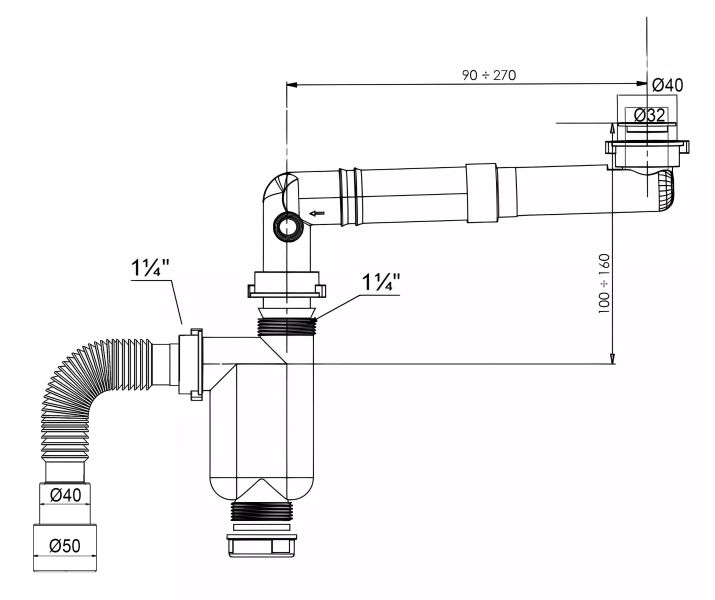 Сифон без выпуска, телескопический, компактный, 32мм-40/50