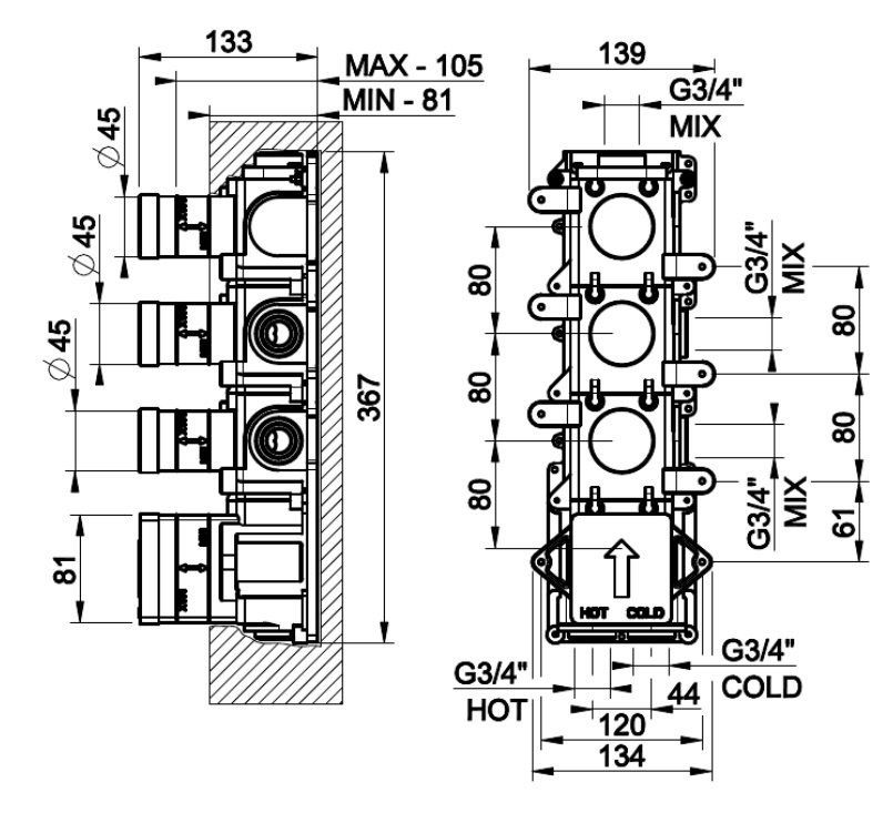 Скрытая часть Gessi для встраиваемого термостатического смесителя с 3 независимыми выходами представляет собой уникальную конструкцию, которая позволяет одновременно подключать три выхода, что обеспечивает гибкость в использовании и настройке водных процедур.