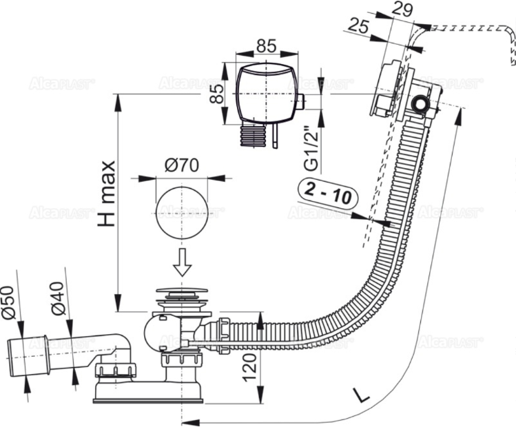 Слив-перелив для ванны AlcaPlast с напуском воды через перелив 57см пластик-металл хром A564CRM1