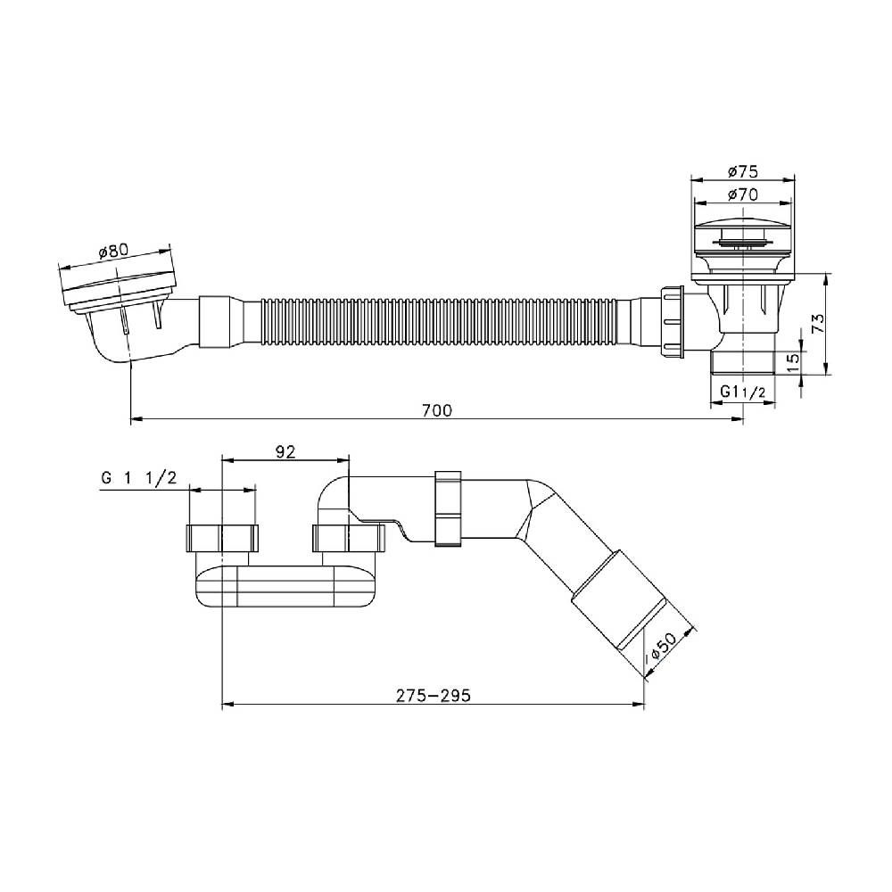 Слив-перелив 1 1/2"х40/50, с переливом и автоматическим сливом для ванн и глубоких душевых поддонов. Конструкция сифона позволяет прочищать сифон, не демонтируя его. С отводом в канализацию.