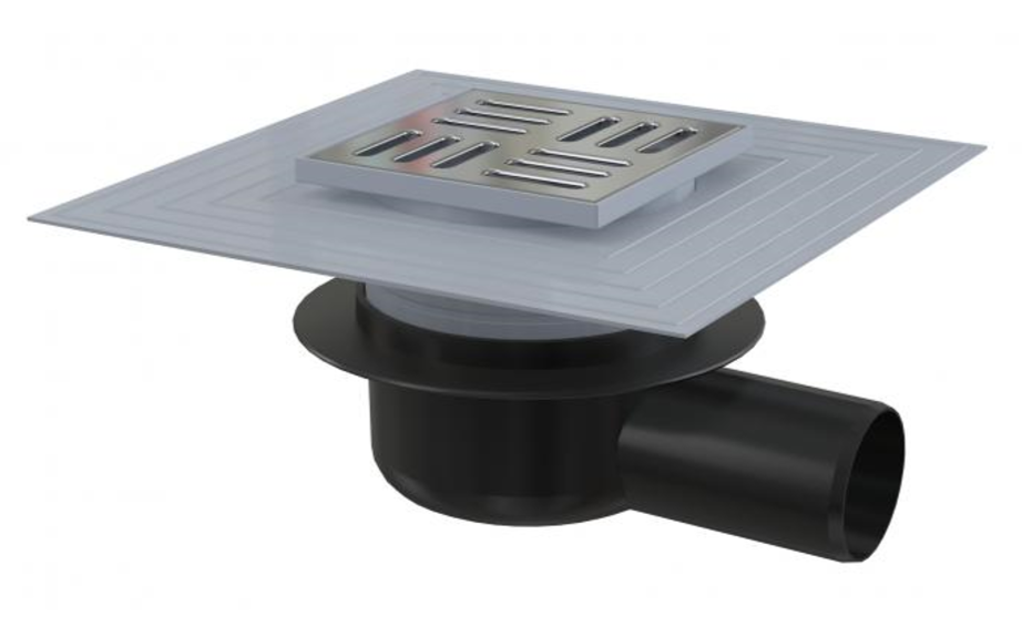 Сливной трап AlcaPlast 105 ? 105/50мм воротник – 2-х уровневая изоляция гидрозатвор – сухой для установки снаружи решетка - хром APV26C