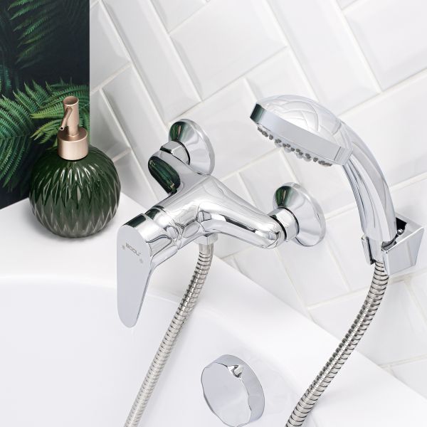 Душевой смеситель ТМ BOOU прост и надежен в использовании. Модель прекрасно впи-шется в интерьер современной ванной комнаты.