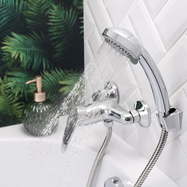 В комплекте удобная трехрежимная лейка с гибким шлангом и настенный держатель.