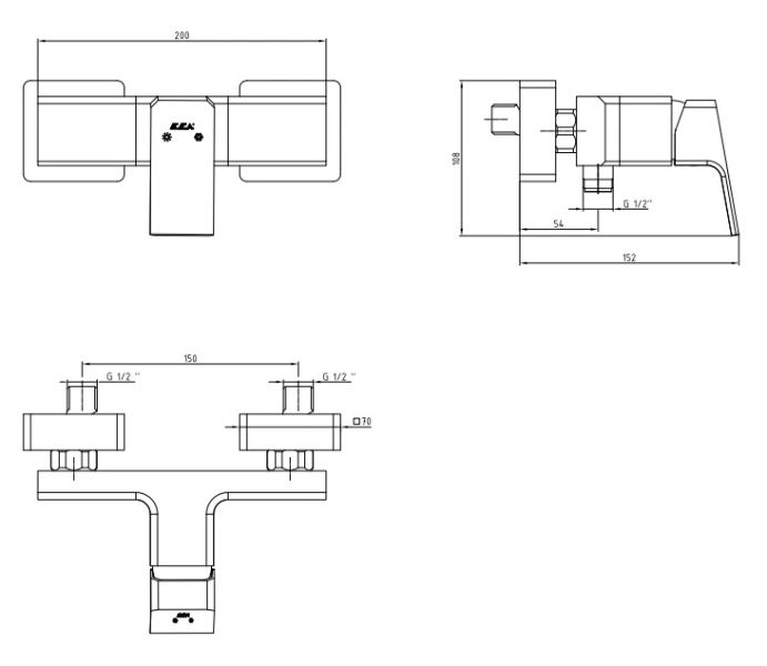 • Ось душевого отверстия: 54 мм